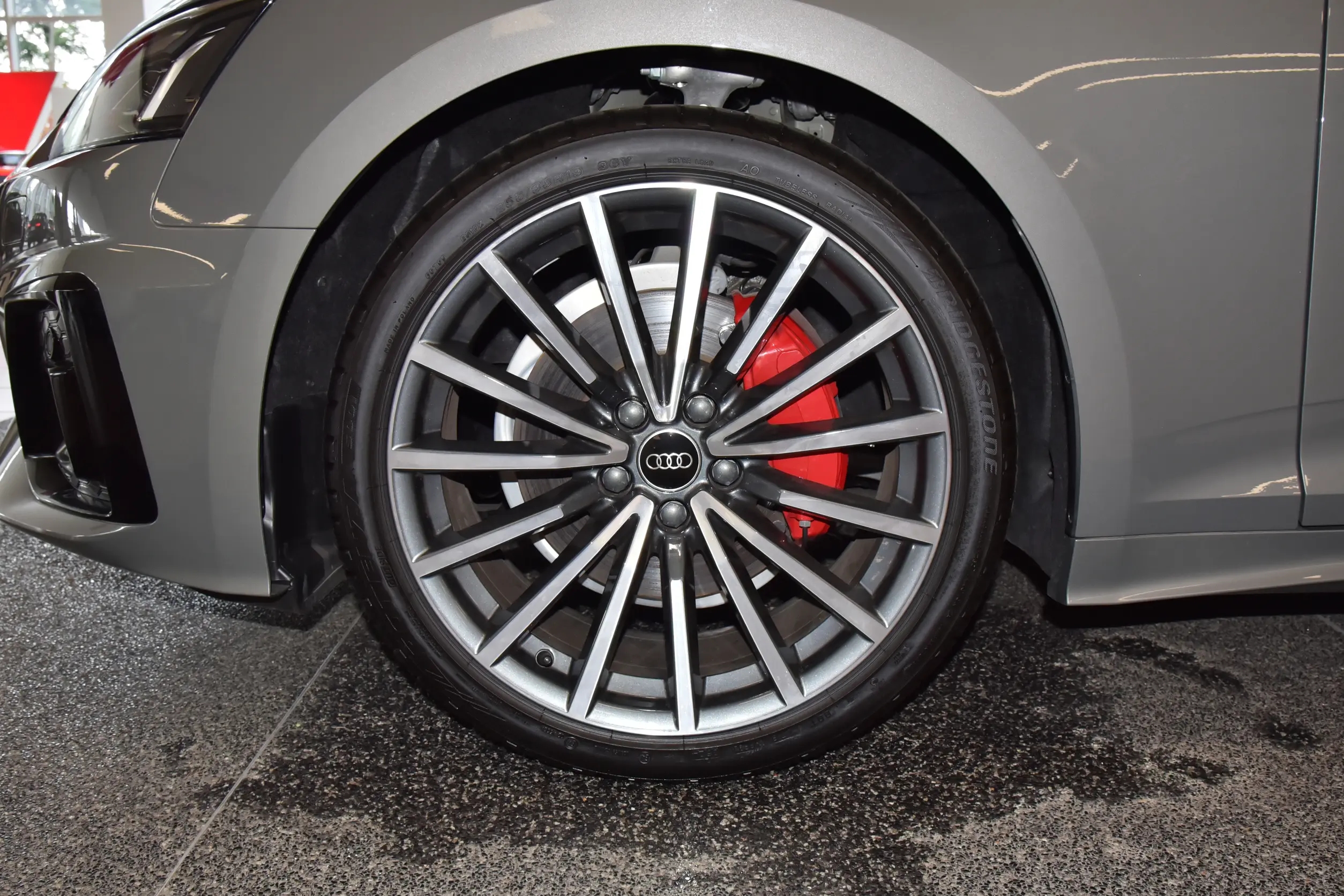五辐式的石墨灰轮毂搭配红色的卡钳停放在停车场,确实看上去很有运动气息,会吸引很多的年轻人。