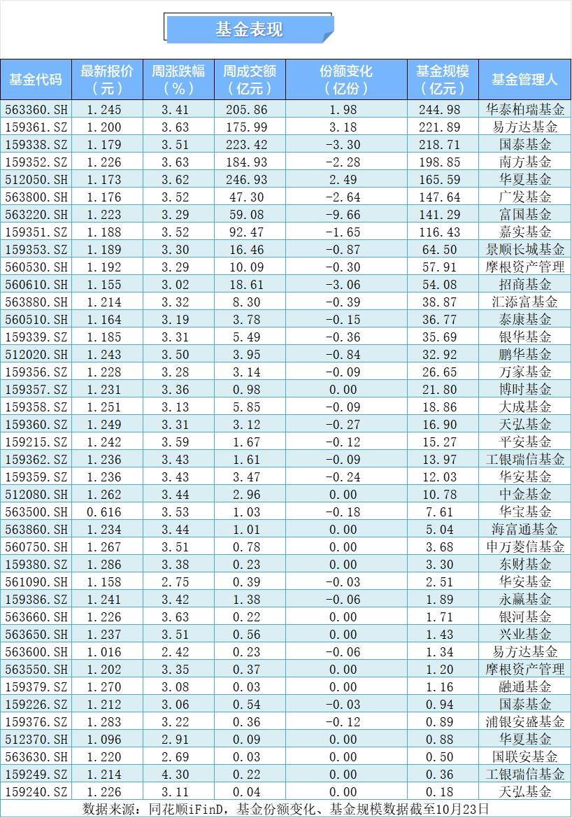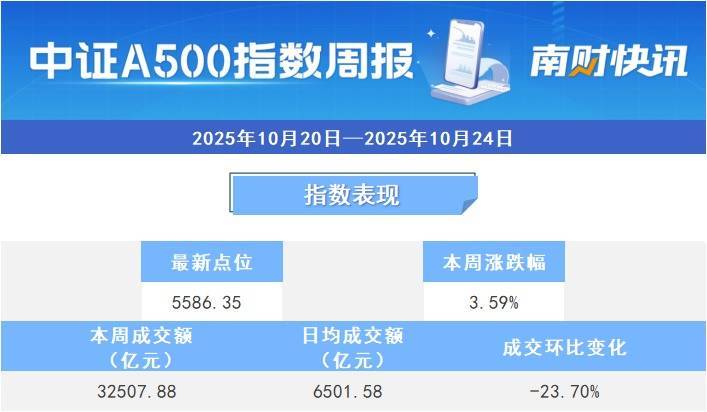 中证A500指数(000510.CSI)本周上涨3.59%,截至10月24日收盘,报5586.35点。本周日均平均成交额为6501.58 亿元,单日成交额环比下降23.70%。